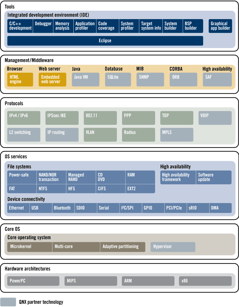 QNX Software Systems has a broad and growing partner ecosystem of established and emerging companies that share our long-term commitment to providing best-of-breed solutions. Coupled with the QNX networking stack, these solutions help our networking customers build high-performance carrier-class systems faster, at lower cost, and more reliably.